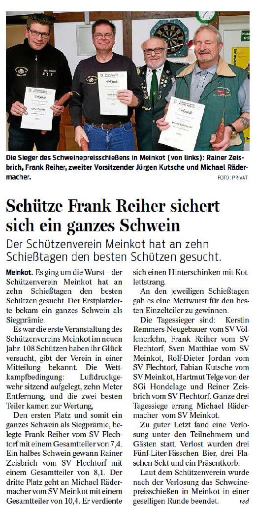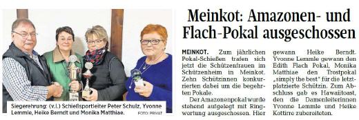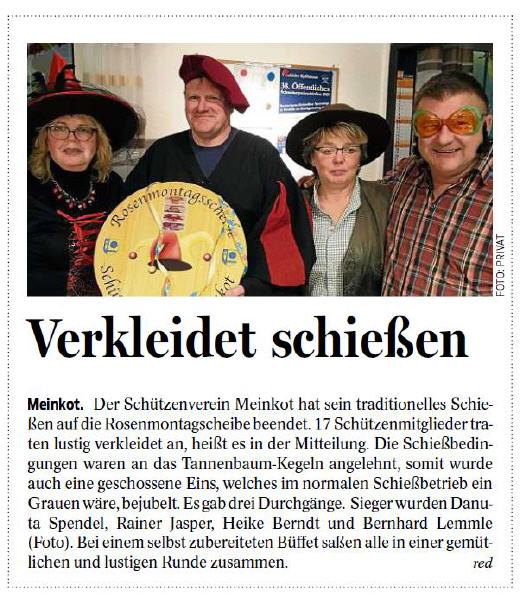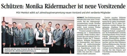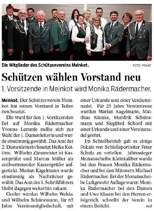 Schützenverein Meinkot (Bericht der WN 01.03.19) Der Schützenverein Meinkot hat mit Monika Rädermacher eine neue Vorsitzende. Wir gratulieren und wünschen ihr für diese verantwortungsvolle Aufgabe viel Erfolg.